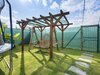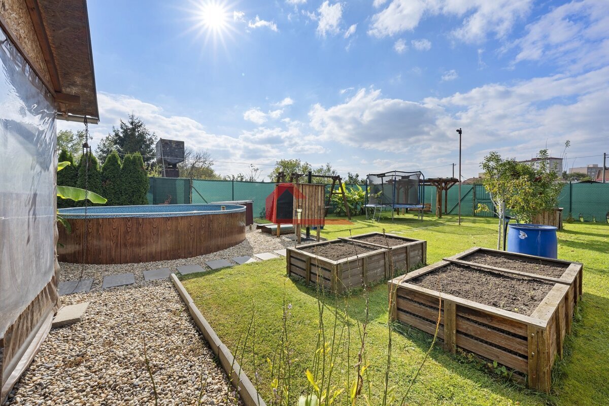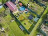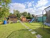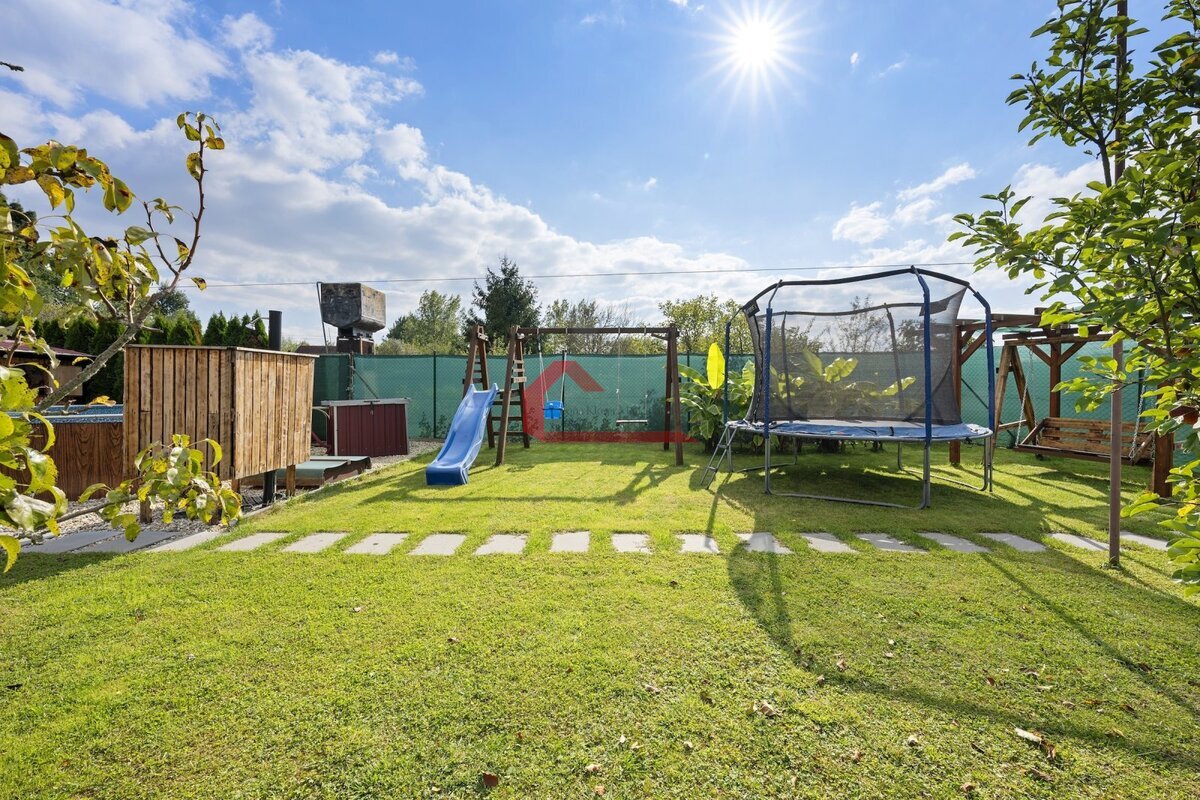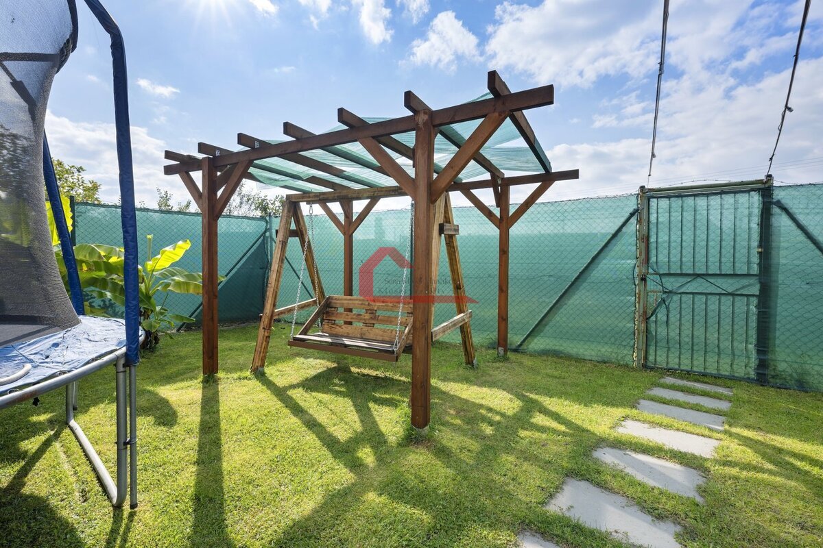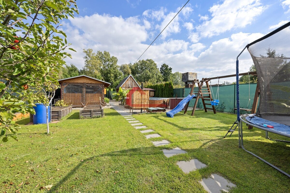 zahradní domeček, trampolína , průlezka se skluzavkou, houpačka a